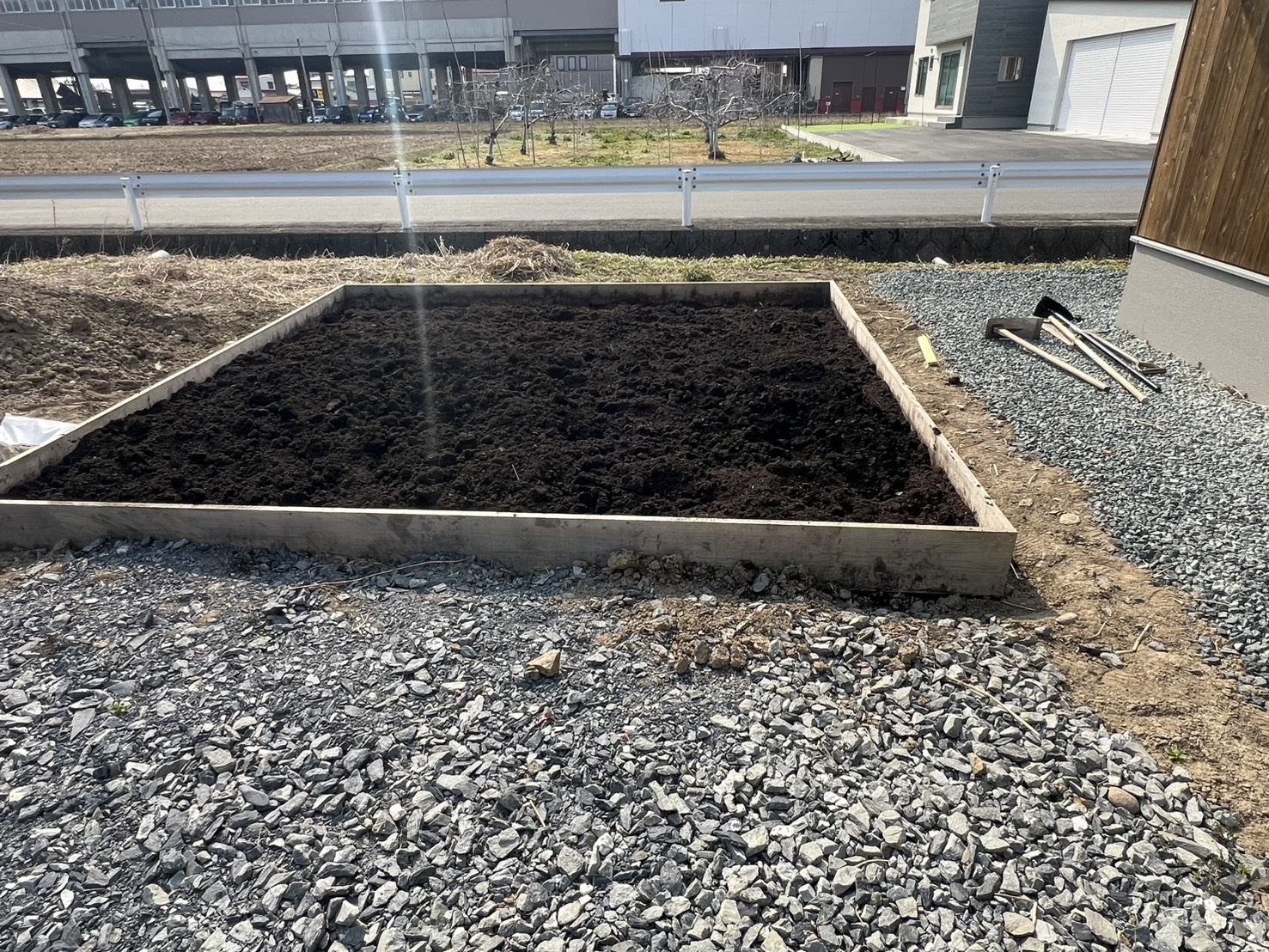 「まずは苗を……」と焦る気持ちを抑えて、まずは何事も基本から。 堆肥をたっぷり混ぜ込み、せっせと土を耕して「土づくり」を行いました。
