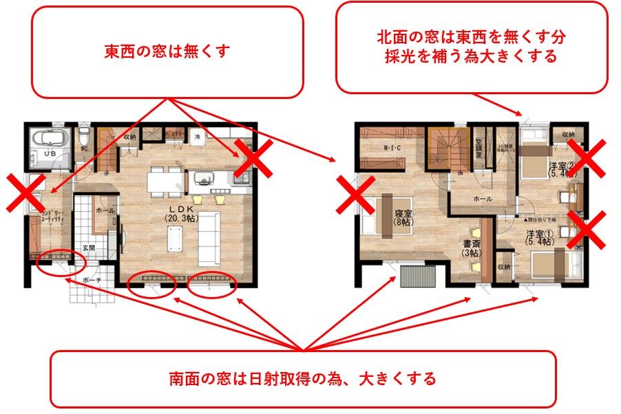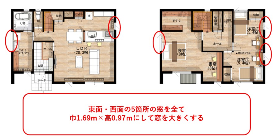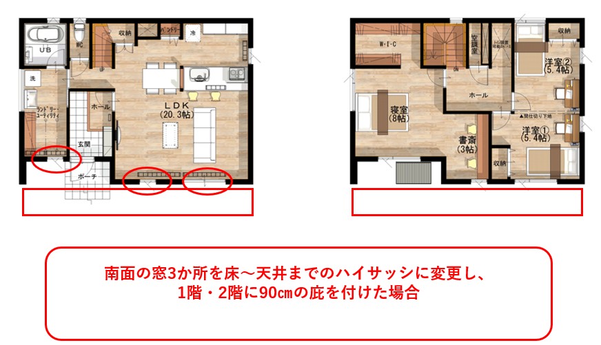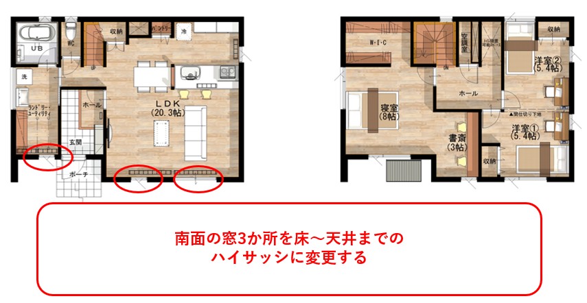 1階南面の3つの窓を高2.03m→高2.43mのハイサッシ