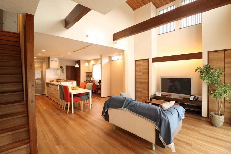 和のスペースは畳の角を取る事で よりLDKとの繋がりを感じやすい設計に。 無垢材と合わせた間接照明は 穏やかな空間を演出してくれます。