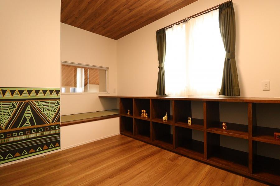 2階に設けた趣味室には、 レコード用の大容量収納を造作。 その一角をカウンターとし、ベンチには 畳を敷いております。 室内窓を設ける事で、 勾配高天井のリビングとの繋がりを感じる 空間としました。