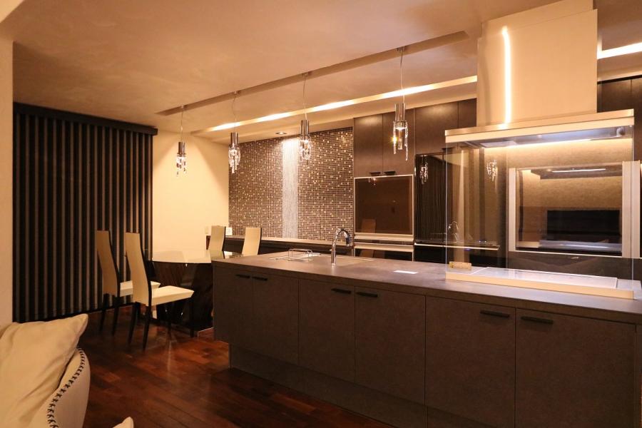 階段の中腹には多目的のカウンタースペースを。ガラスブロックヤやタイルが、一つ一つに高級感を与えます。