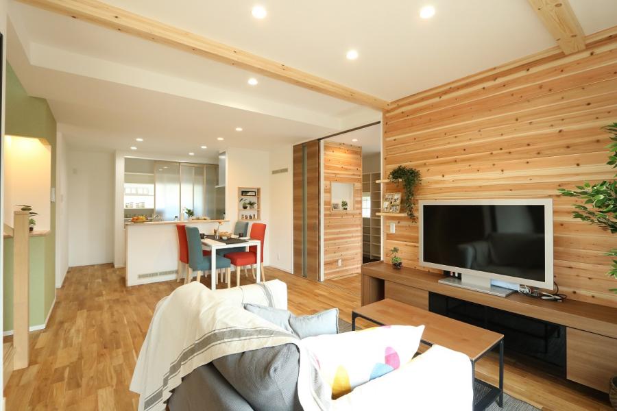 リビングで最も目を引く杉の羽目板。暮らしていくと共に経年変化を経てより一層味のある空間へ。
