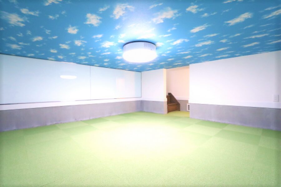 床下利用のキッズスペースには【ラコベルプリュム】のカラーガラスを壁に施工。 ガラス面にお絵描きをして楽しめます。