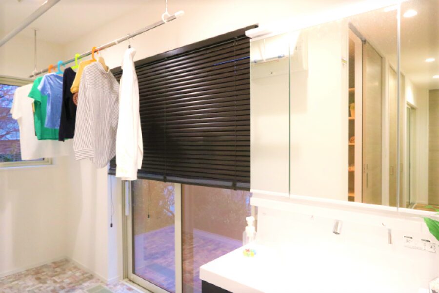 物干しスペースにブラインドを付けることで 大きい窓でもプライバシーを守りつつ、通風を確保できます。