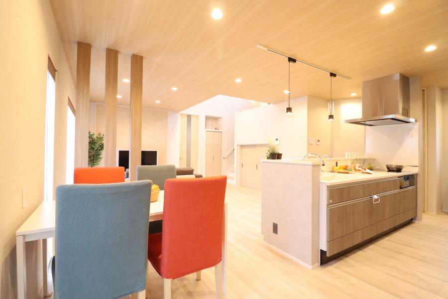 床、建具、アクセントクロス、 天井を同一色でまとめる事により LDKが一体感のある空間に仕上がりました。
