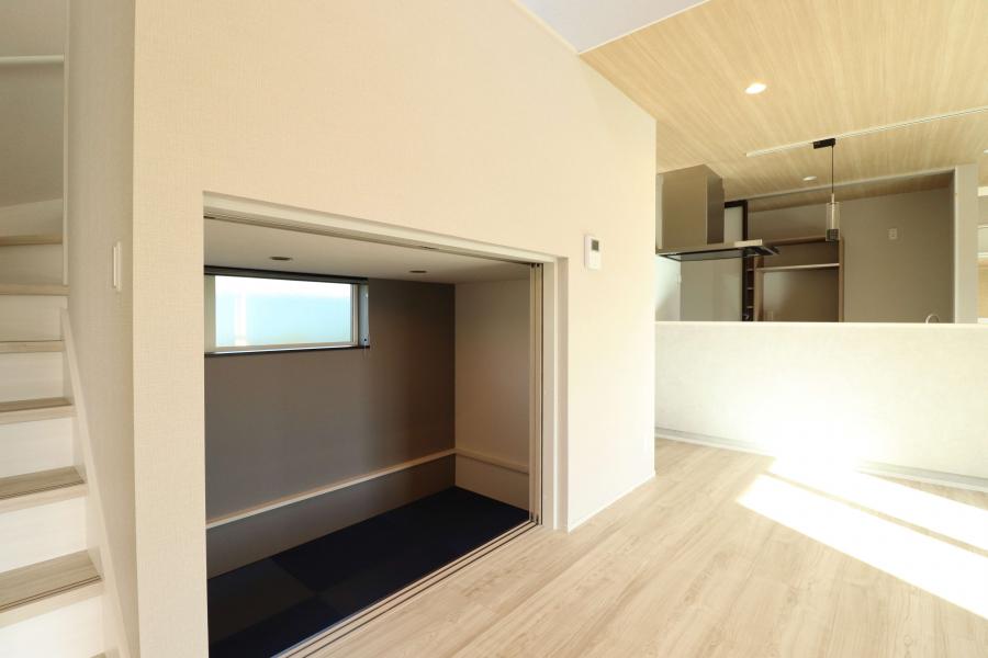 ダウンフロアはネイビーの畳、グレーのクロス、ブラックの窓台で LDKとテイストを変え、特別感のある空間で お茶屋や読書を楽しめます。