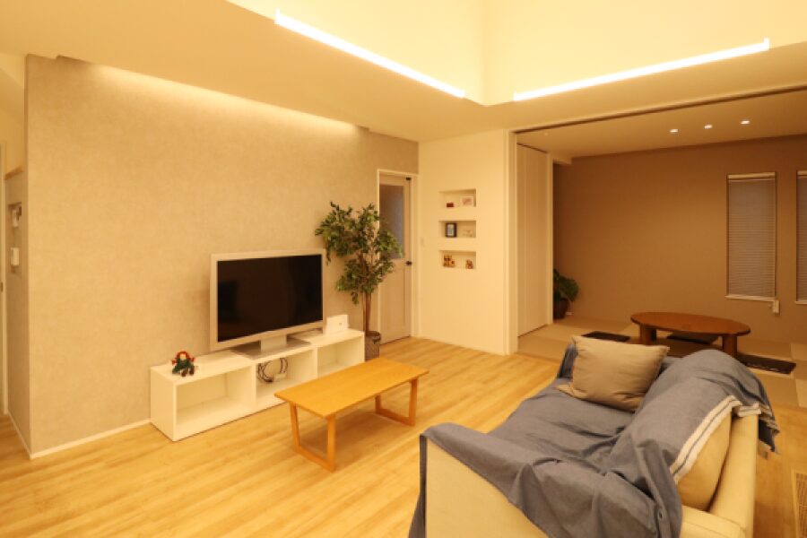 TV背面壁にはコンクリート風の クロスを採用しています。 凹凸のあるクロスの為、 間接照明の光が優しく広がります。