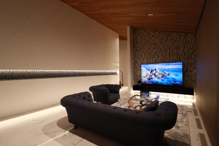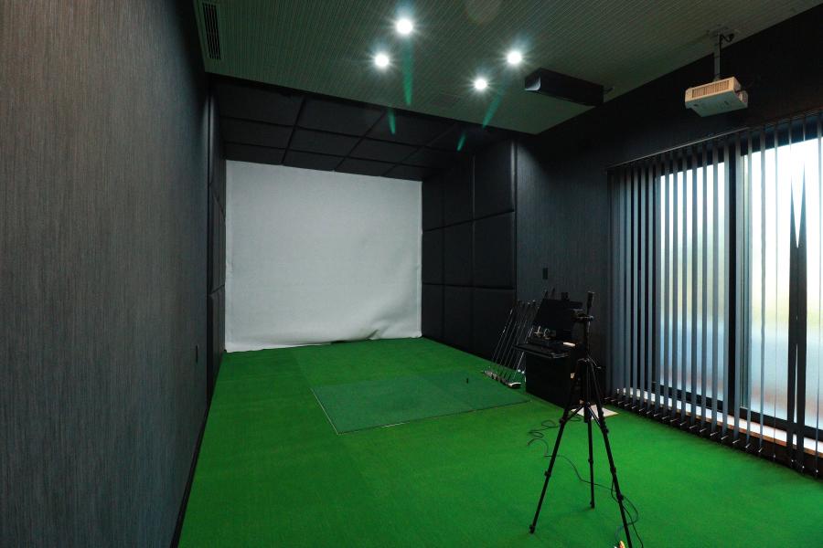シュミレーションゴルフをする為に17帖もの広い空間とし、正面壁のスクリーンに打ち込めるような配置としました。プロジェクターの画面が見やすいように部屋を黒で統一し、床には人工芝を敷き詰めました。時間に左右されず楽しめるよう、壁に防音対策を施し家にいながらご友人と世界のゴルフコースでラウンドする事ができます。