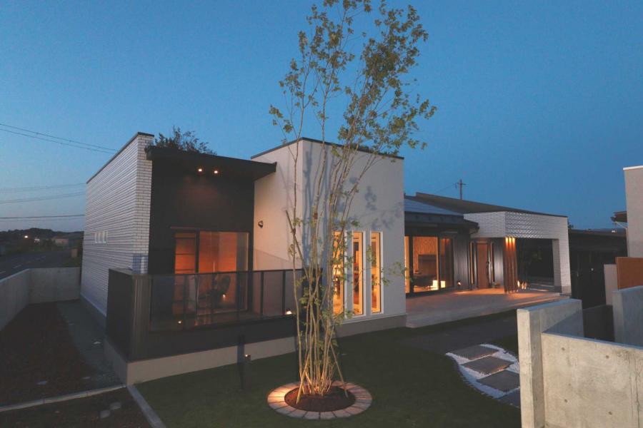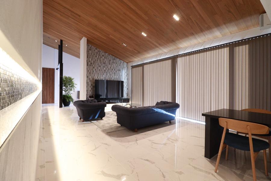 リビングは広さを感じられるようにⅬ型で奥に視線が抜けるような形状とし、奥へ誘うような7m以上の長いニッチ棚を設けました。床には鏡面タイル、壁は漆喰、勾配高天井にはチーク材、アクセント壁にはタイルを用い、高級感を演出しました。