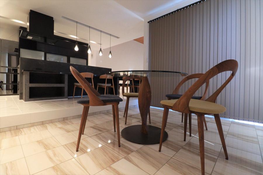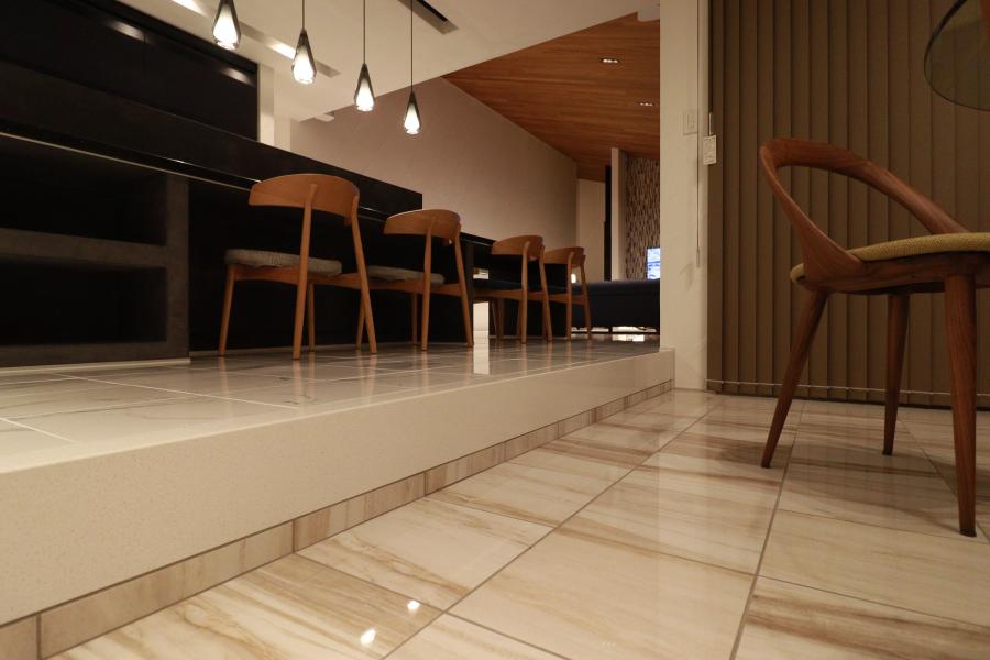 キッチンカウンターの後方にはダウンフロアと、タイルで空間を区切った内テラスを設けました。ブラインドを開けるとデッキに囲まれた間取りに。段差の側面はタイルのバランスを考え、仕切りのパターンまでこだわりました。