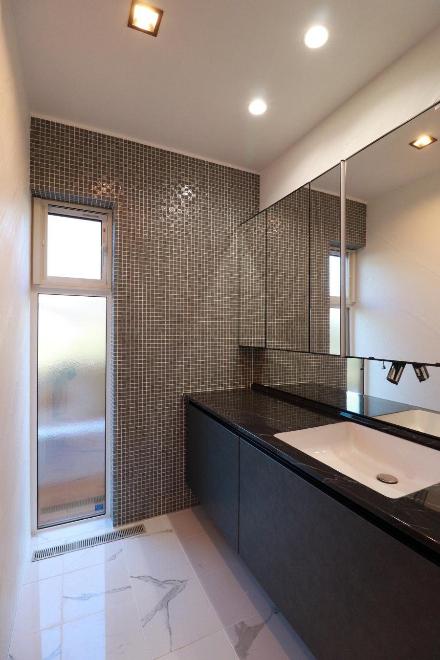 ホテルライクな洗面台にタイルを合わせてより上質な空間としました。採光窓の陽の光が日中と夜間の表情を変化させます。