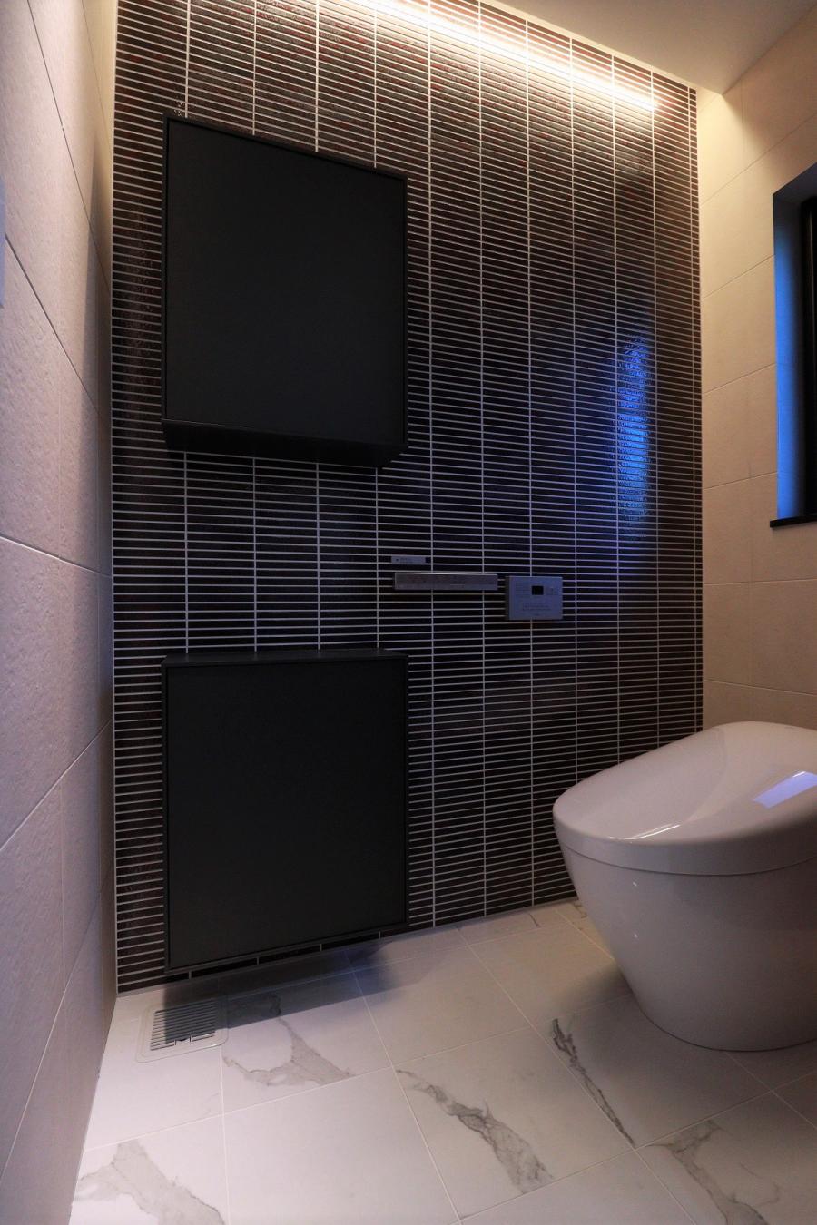 エコカラットに和モダンな雰囲気のタイルを合わせ特別感を。間接照明で落ち着いた雰囲気のプライベート空間に。