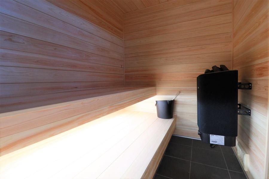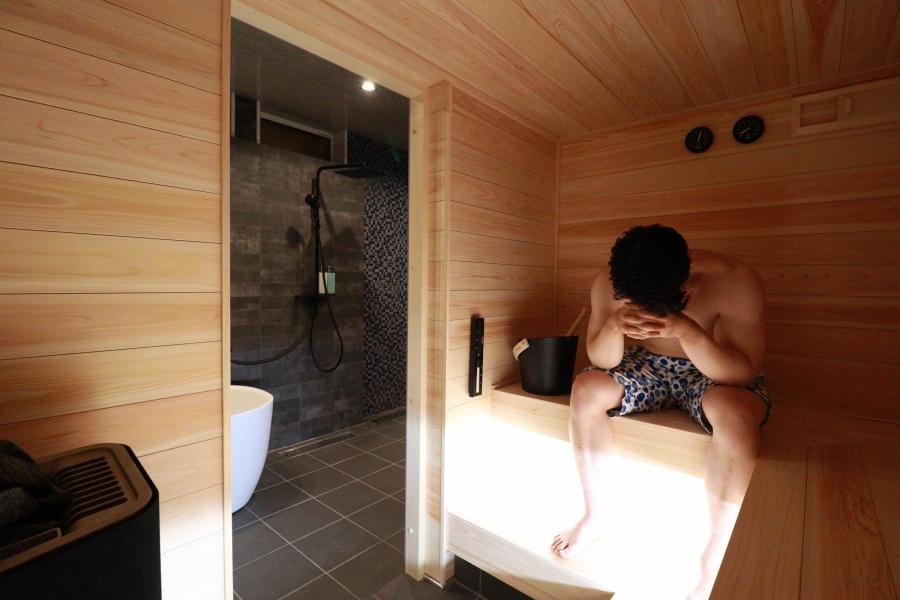 ひのきの心地よい香りに包まれるドライサウナはゆっくりと寝そべることができるサイズ。間接照明により、リラックスできるスペースに。
