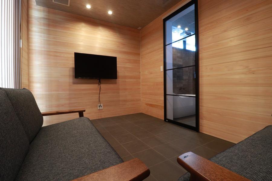 シャワーで汗を流した後、ゆったりとくつろげるヒノキ張りの休憩スペースを設けました。テレビを見ながら休憩した後、再度サウナを楽しむことができます。