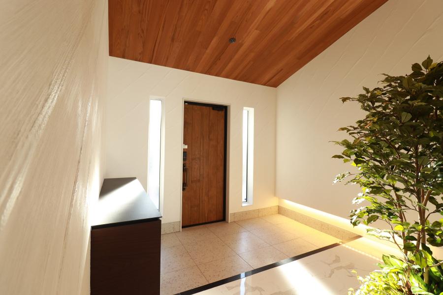 玄関を開けた瞬間に一体感を感じる事ができるようドアと天井を木目で統一しました。勾配高天井が開放感を演出します。「非住宅」感を強調するためのシンメトリーに配置された窓を設けたことで十分な採光を確保しタイルや表情豊かな白い漆喰壁に反映され明るく、洗練された空間が完成しました。