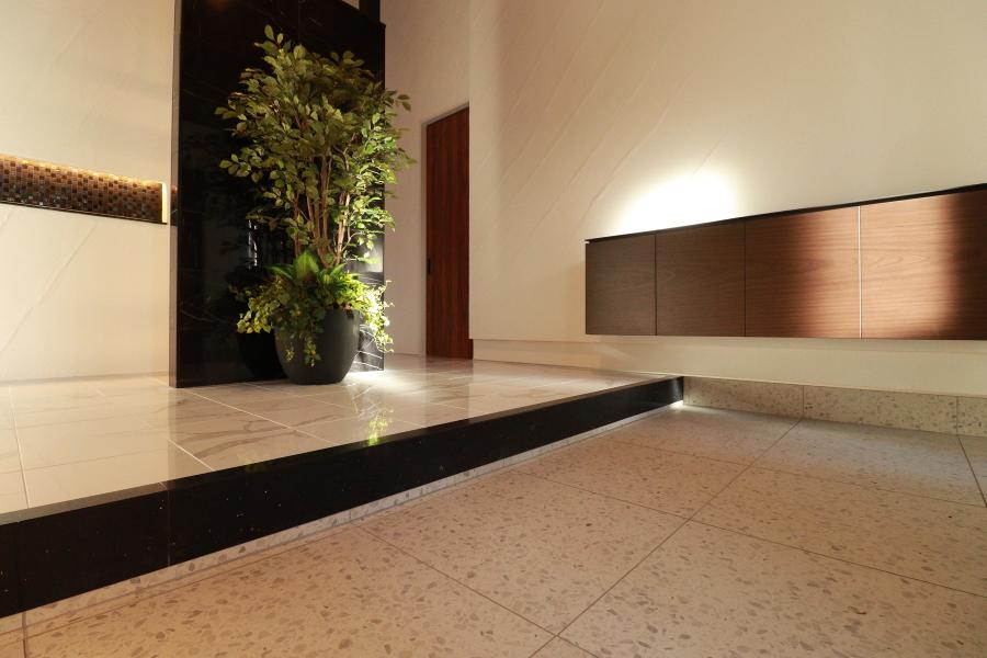 玄関タイルはクラシックかつモダンな雰囲気を出しシルバーで幅の薄い巾木がよりシャープな印象を与えます。つや感のあるブラックの框をアクセントとし 空間にメリハリをつけました。S.I.Cはあえて作らずフロートタイプの必要最小限の収納とする事でこの広さを確保しました。