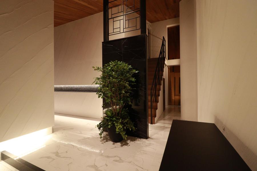 玄関正面にブラックの鏡面仕上げの壁で緩く間仕切りを設けました。間仕切り壁の前には鉢植えのグリーンを置き、爽やかに。また、家族動線と階段を目隠しして生活感の無い玄関としました。