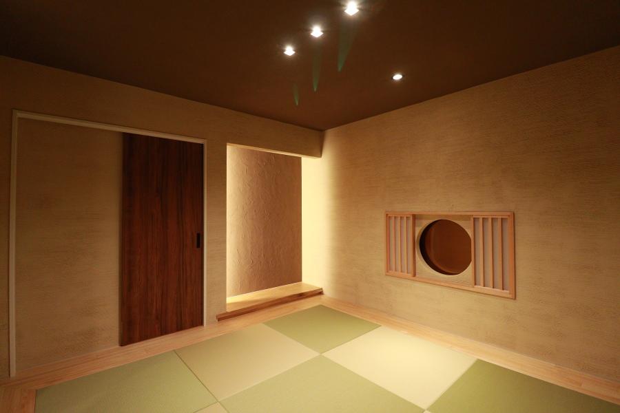 くつろげる和室。けいそうの壁は照明があたり陰影が生まれ、やわらかな表情になります。東側にモミジを眺める丸窓を設け、床の間の地板には木肌の美しいニレの木を採用しました。一見、押入れと思える引き戸は開けると約4帖ものW.I.Cとなっており収納力も抜群です。