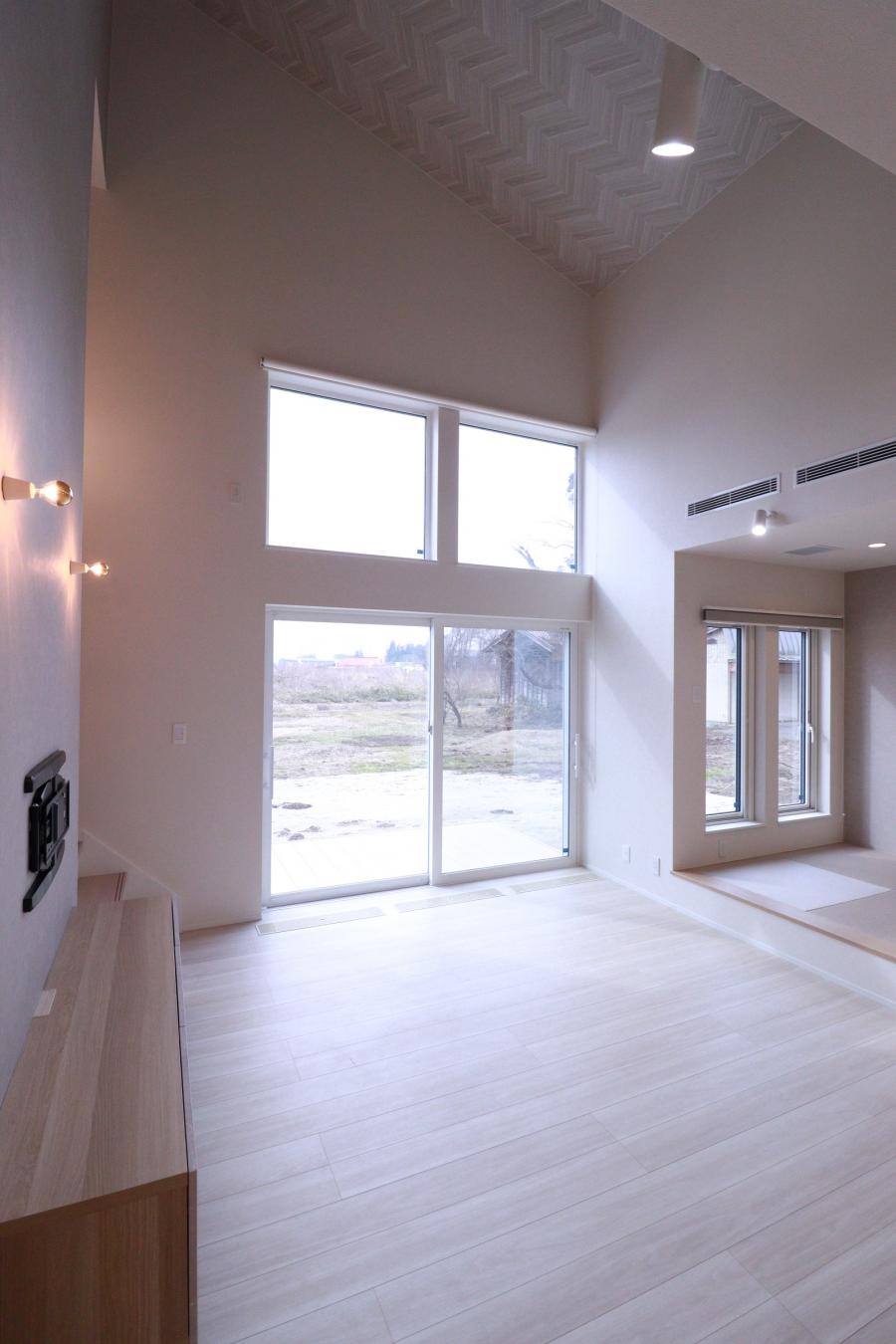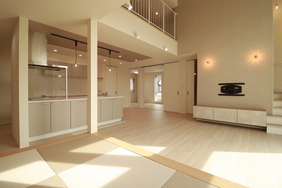 大きな窓から心地よい陽の光がリビングへ差し込みます。小上がり畳スペースはお子様が遊んだりお昼寝するのにも重宝します。