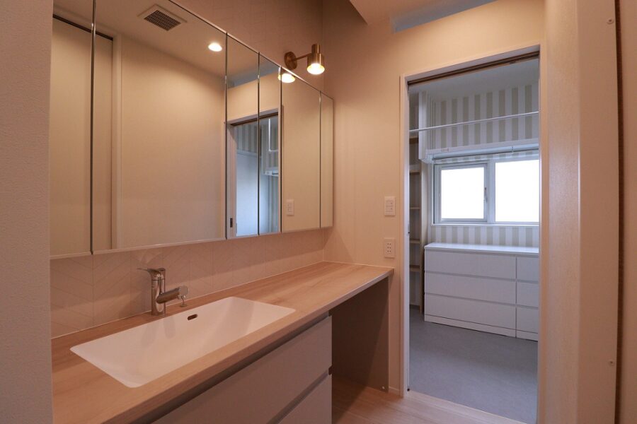 収納BOXの三面鏡を壁埋め込みにする事でスマートな印象に。真鍮の照明がデザイン性を高めます。リビングから水回り、サンルームと回遊動線でつなげ、暮らしやすい平屋としました。