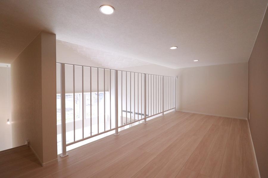 大きなものも収納できる5.4帖の小屋裏収納。リビング方向の壁をスリットの手摺とする事で圧迫感を軽減し、陽の光も取り込みました。
