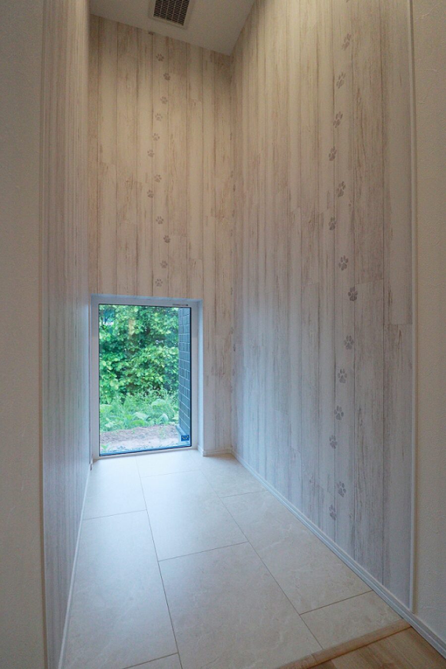 廊下の奥にペットスペースには外を眺める窓を設け、わんちゃんにとって快適空間に。足跡がかわいいクロスと、傷つきにくいペット対応の床材を採用しました。