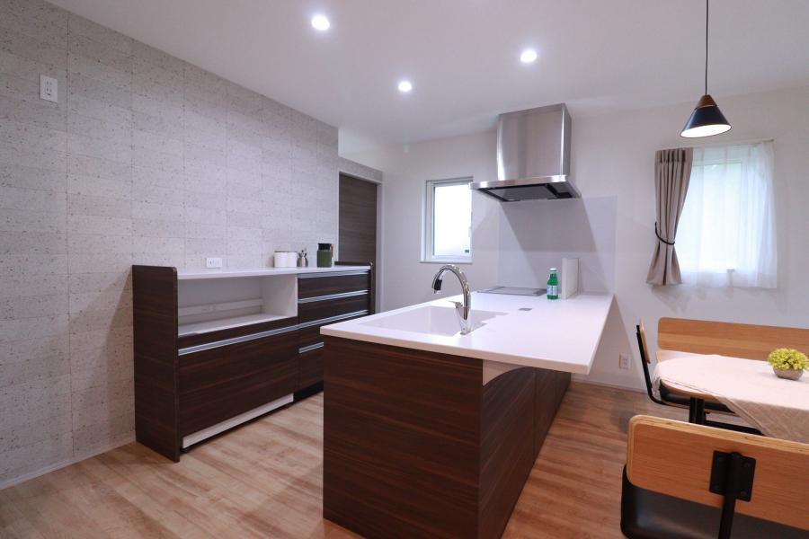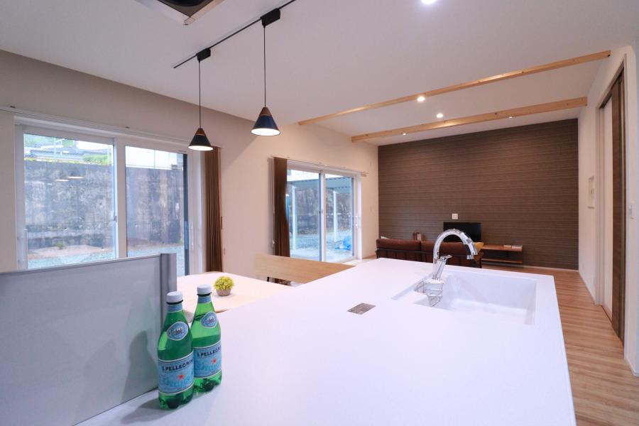 オープンスタイルのキッチンはお庭やリビングを見渡しながらお料理を楽しめます。キッチン背面のドアはサンルームへつながる家事ラク動線となっています。