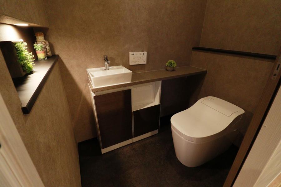 あえて照度を落とし落ち着いた雰囲気を演出。飾り用ニッチにも照明入れ、こだわりのトイレに。